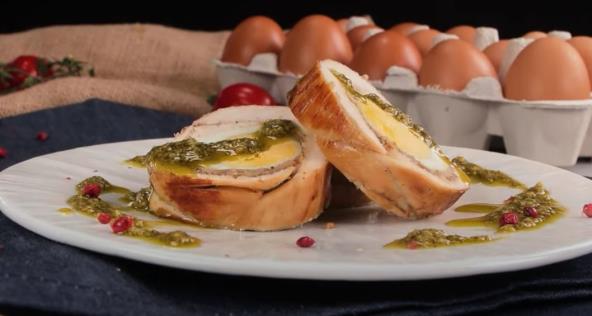 Po mogućstvu uzmite pileće grudi u komadu, pa ih nožem lagano rasecite, ali pokušajte da ne odvajate šnicle nego da dobijete spojenu celinu, koju ćete potom malo izlupati tučkom za meso. Začinite odozgo po ukusu. U tiganju propržite sitno seckani luk sa pečurkama, dok blago ne porumene, pa ih stavite preko mesa. Tvrdo kuvana jaja u komadu poređajte odozgo, pa lagano urolajte meso, pazeći da vam fil ne ispadne. Pričvrstite ga običnim koncem za šivenje, da se u toku pečenja ne bi rastvorilo. Stavite u pleh i prelijte uljem. Pecite na 180 stepeni nekih 30-35 minuta.