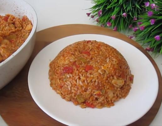 Isecite papriku, paradajz i luk na kockice. Propržite luk na malo ulja, pa dodajte papriku. Posle par minuta, dodajte i meso isečeno na kocke. Začinite po želji, a onda dodajte i paradajz. Kuvajte dok meso ne bude gotovo. Dodajte opran pirinač i sipajte vodu. Poklopite i kuvajte dok ne bude gotovo. Ako vidite da je suvo, povećajte količinu vode.