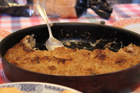 Pola glavice luka propržite na masti zajedno sa seckanom pančetom ili slaninom. Dodajte potom seckan kupus i ostavite da se krčka. Nalijte malo vode. Batake skuvajte pa meso iscepkajte. Dodajte ga u kupus pa sve promešajte. Ubacite i biber u zrnu i lovorov list. Krčkajte dok kupus ne omekša. Za zapršku propržite drugu polovinu luka sa kašikom mlevene slatke paprike. Prelijte preko kupusa i ubacite ga urernu da se lepo zapeče na 200 stepeni.