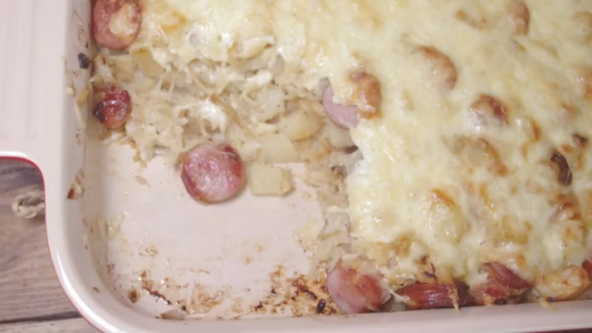 Skuvajte krompir u ljusci, pa isecite na kolutove. Ispržite sitno seckani crni luk, a zatim dodajte i iseckanu slaninu i kobasicu isečenu na kolutove. Sipajte bujon (150 ml) i dinstajte nekih 20 minuta, a ako je potrebno dolijte još vode. Tepsiju premažite uljem, pa poređajte krompir, zatim kiseli kupus kao za podvarak, zatim kobasice, slaninu i luk, pa još jedan red krompira. Pecite na 200°C oko 20 minuta, pa sipajte preostali bujon i pecite još 20 minuta. Pred kraj pečenja pospite rendanim sirom.