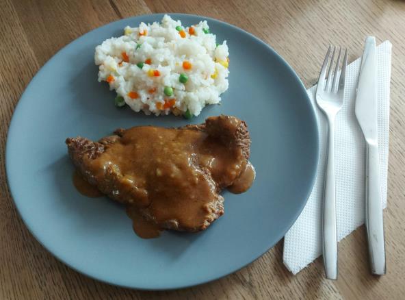 Crni luk iseckajte i prodinstajte na malo ulja, a zatim dodajte šnicle koje ste premazali sa malo senfa i prelijte sa malo vode (da pokrije meso). Dodajte začinsku papriku i paradajz sos, pa ostavite da se krčka oko sat vremena na tihoj vatri. Pred kraj pomešajte brašno i vodu i sipajte u šnicle. Na kraju dodajte manje od pola kockice čokolade za kuvanje i promešajte dobro.