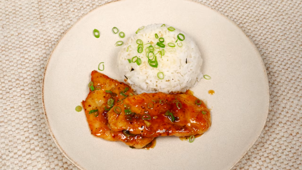 Isecite belo meso na tanje šnicle, posolite i pobiberite. Otopite u tiganju kašiku putera. Šnicle uvaljajte u brašno pa spuštajte u zagrejan puter. Pržite dok se ne razumeni na obe strane. Potom dodajte seckan beli luk i drugu kašiku putera, na sredinu tiganja. Ubacite još i sirće, soja sos i med. Neka se sve zajedno krčka. Meso okrećite kako bi upilo sokove. Na kraju iseckajte perca od praziluka i stavite odozgo. Servirajte uz pirinač.