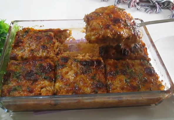 Kupus isecite sitno, kao i papriku, peršun, crni i beli luk, a šargarepu izrendajte. Pomešajte sve namirnice, pa dodajte mleveno meso i sjedinite. Začinite po želji (u receptu su kurkuma, đumbir, so, biber, mlevena paprika). Dodajte i brašno, jaja, mleko, ulje i paradajz pire, pa dobro promešajte. Sipajte u nauljenu tepsiju i poravnajte. Pospite mlevenom paprikom i pecite na 180°C dok ne dobije zlatno braon boju. Pred kraj pospite rendanim sirom i seckanim peršunom, pa vratite da se peče još pola sata.