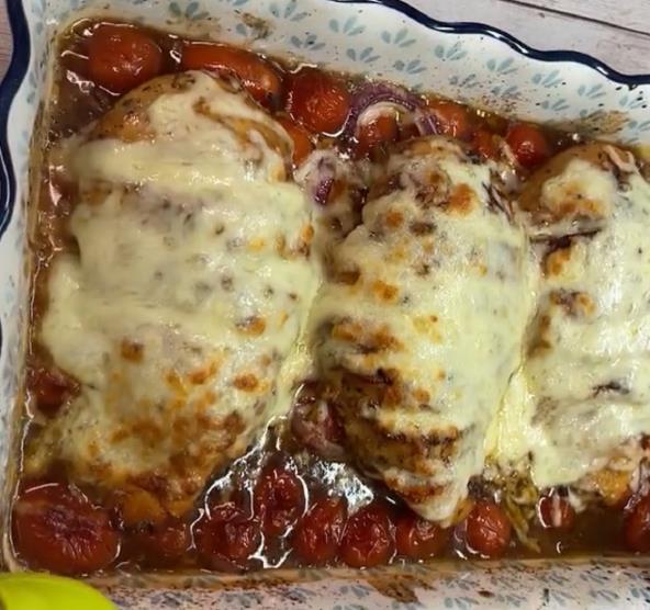 Zasecite meso po širini, da napravite trake. U tanjir sipajte maslinovo ulje, balzamiko i šećer. Dodajte začine i seckani beli luk, pa promešajte. Lepo uvaljajte meso u marinadu i ostavite pola sata. U tepsiju stavite čeri paradajz i isečen luk na rebarca. Prelijte maslinovim uljem i posolite. Preko stavite meso i sipajte preostalu marinadu. Pecite na 220°C oko 25 minuta. Pospite rendanim sirom i vratite kratko u rernu da se sir otopi.