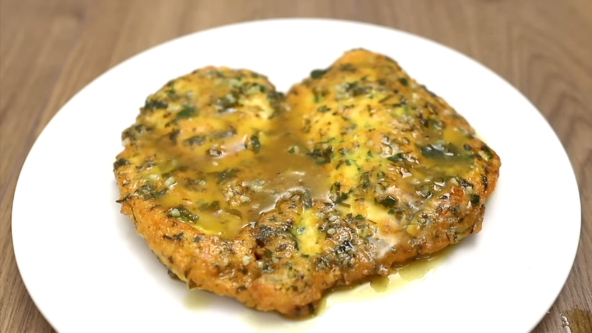 Peršun iseckajte, pa pomešajte sa jajetom i parmezanom. Začinite po želji, pa dobro sjedinite. Piletinu presecite na pola, ali ne skroz do kraja. Treba da se otvori i napravi veći komad (pogledajte sliku). Zatim pokrijte folijom, pa stanjite tučkom za meso. Uvaljajte u brašno, a zatim u smesu sa jajima. Ispržite na zagrejanom puteru sa obe strane. Izvadite meso, pa sipajte vino, bujon, mleveni beli luk, limunov sok i seckani peršun. Dodajte i puter (15 g), pa kuvajte dok se ne otopi, a onda vratite meso. Ostavite tako 5 minuta, a povremeno meso prelivajte sosom.