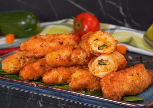 Meso isecite na šnicle, pa izlupajte. Tikvicu izrendajte, a zdenku izdrobite viljuškom. Pomešajte i dodajte rendani čedar. Sve dobro sjedinite. Začinite po želji. Stavite kašiku smese na meso, pa urolajte. Umočite u umućena jaja, pa u brašno i opet u jaja. Ispržite u zagrejanom ulju.