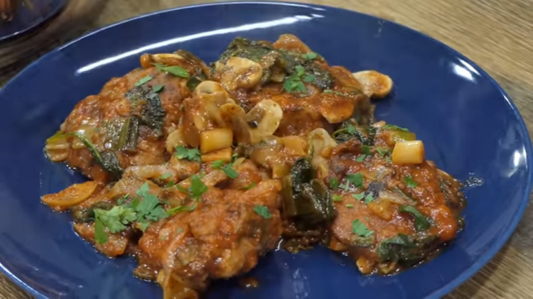 Izvadite meso i u isti tiganj dodajte još malo maslinovog ulja i pržite praziluk i crni luk 5 minuta na srednjoj vatri. Dodajte so. Dodajte pečurke, pržite 8 minuta na srednjoj vatri. Zatim dodajte spanać i pržite 3 minuta.