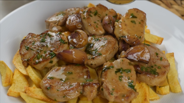 Beli luk očisite i presecite po sredini, ali ne do kraja (čenovi treba da ostanu celi). Sa mesa skinite masnoću i isecite šnicle debljine 2 cm. Propržite meso na zagrejanom ulju, pa izvadite. Stavite luk, kratko propržite, pa vratite meso. Sipajte vino i vodu (bujon) i ostavite još 5 minuta da se krčka. Pospite seckanim peršunom.