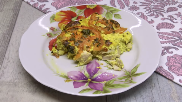 Piletinu iseckajte na kockice, pa stavite u vatrostalnu posudu. Jaja umutite i dodajte pavlaku za kuvanje, pa promešajte. Sipajte začine i prelijte preko mesa. Paradajz isecite na kolutove, pa stavite preko piletina i pospite seckanim peršunom. Pecite na 200°C oko 20 minuta.
