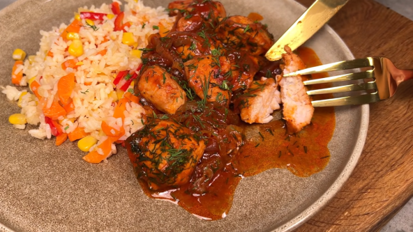 Sočno i ukusno belo meso je uvek dobar izbor za ručak, a pogotovo kada se napravi u paradajz sosu sa lukom. Kao prilog poslužite pirinač sa raznovrsnim povrćem. Dobar je predlog i za nedeljni ručak, a posle se poslužite keks tortom sa belim filom. Nije teško da se pripremi, a ukus će vas očarati.