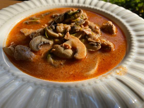 Propržite sitno seckan crni luk, a zatim dodajte piletinu iseckanu na kockice. Dinastajte nekih 10 minuta, pa pospite seckanim peršunom i brašnom. Zatim sipajte supu i belo vino i promešajte. Posolite, pobiberite, stavite ostale začine i kuvajte poklopljeno na tihoj vatri nekih 1,5 vremena. Zatim dodajte pire od paradajza i iseckane pečurke, pa kuvajte još pola sata.