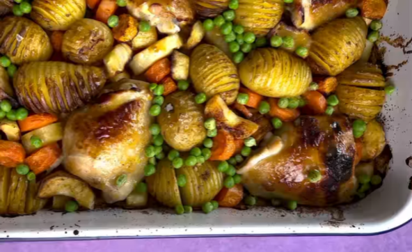 U veliki pleh za pečenje stavite piletinu a praznine popunite povrćem. Stavite u prethodno zagrejanu rernu na 200 stepeni oko 35-40 minuta dok piletina ne poprimi zlatnu boju. Izvadite iz rerne, pospite smrznuti grašak i prelijte ostatkom marinade koja je ostala u činiji. Pokrijte folijom i krčkajte još 10 minuta. Služite odmah.