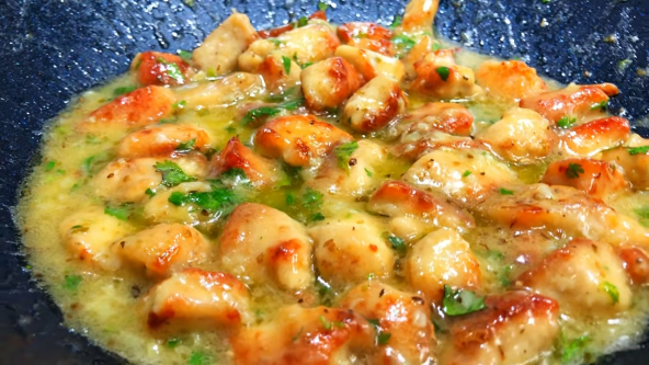 Meso isecite na kockice, pa posolite i pobiberite i pospite beli luk u prahu. Promešajte, pa sipajte brašno (1 kašiku) i dobro promešajte. Ispržite na ulju, pa izvadite iz tiganja. U istu posudu dodajte i 2 kriške putera, pa kada se istopi sipajte brašno (1 kašiku). Promešajte i dodajte seckani beli luk, origano i limunov sok. Promešajte i sipajte vodu ili bujon. Vratite meso i ostavite da proključa. Pospite seckanim peršunom.