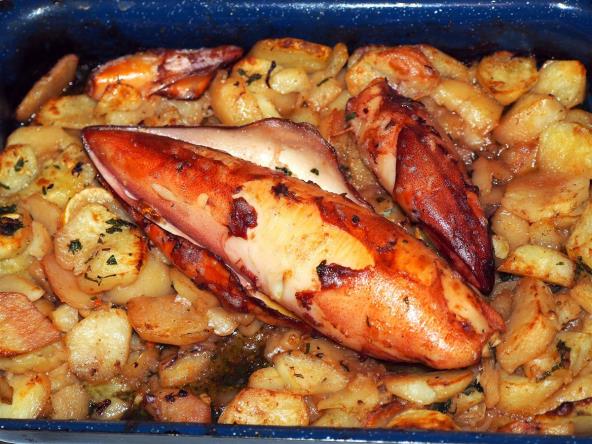 Luk i beli luk sitno naseckajte, zajedno sa krakovima od lignji, pa ih propržite na maslinovom ulju, dodajte sitno naseckan peršun i sve dinstajte nekih 5 minuta. Pred kraj dodajte začine po ukusu, prezle i sklonite sa ringle. Lignje napunite dobijenom smesom, pa ih zatvorite čačkalicom. Krompir oljuštite i isecite na deblje kriške. Lignje poređajte u vatrostalnu zajedno s krompirom, pa sve prelijte sa maslinovim uljem i belim vinom. Pokrijte folijom i pecite u rerni zagrejanoj na 180 C oko 45 minuta. Nakon tog vremena skinite foliju i pecite još 15 minuta dok ne dobiju lepu zapečenu koricu.