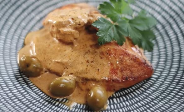 Meso isecite na tanke šnicle, pa dobro posolite, pobiberite i pospite začinskom paprikom. Zatim stavite da se prži na malo ulja, okrenite na drugu stranu, a onda dodajte veće parče putera. Prelijte sokom koje je meso pustilo, pa izvadite na tanjir. U isti tiganj dodajte origano i seckani beli luk. Kada se malo proprži sipajte belo vino i dodajte masline. Umešajte pavlaku i lepo promešajte. Posle par minuta vratite meso sa sve sokom i ostavite da se krčka još par minuta.