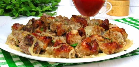 Meso iseckajte na kockice, a zatim dodajte mleveni crnu luk (1 komad). Posolite i pobiberite, pa dobro promešajte. Pokrijte providnom folijom i ostavite sa strane. Zatim preostali crni luk iseckajte na rebarca, pa prelijte vodom, sirćetom, pospite so i šećer. Promešajte i ostavite da se marinira nekih 10-15 minuta. Vatrostalnu posudu nauljite, pa poređajte marinirani luk koji ste procedili. Preko stavite meso i pokrijte aluminijumskom folijom. Pecite na 220°C oko 30 minuta.