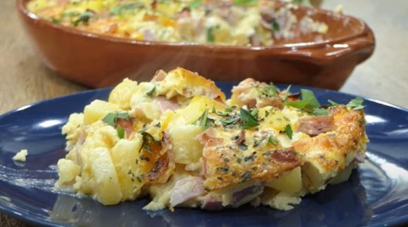 Krompir iseckan na kockice skuvajte u slanoj vodi. U činiji umutite jaja sa pavlakom, dodajte seckanu šunku, sir i peršun. Začinite solju, biberom i origanom. Sve dobro izmešajte i dobijenu smesu dodajte krompiru. Sipajte u kalup. Pecite u prethodno zagrejanoj rerni na 200°C 25 minuta.