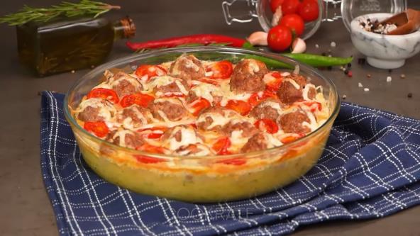 U kuvan krompir dodajte so, biber, mirođiju i puter pa izgnječite. Dobijenu smesu utisnite na dno vatrostalne posude. U mleveno meso dodajte jaje, prezle, seckan crni luk, so, biber, mlevenu slatku papriku. Izgnječite rukama smesu. Formirajte ćufte i stavljajte preko pire krompira. Čeri paradajz isecite na pola pa svaku polovinu ređajte između ćuftica. Pomešajte sastojke za sos prelijte preko i pecite na 180 stepeni 35 minuta. Stavite rendan sir pa vratite u rernu na 10 minuta.