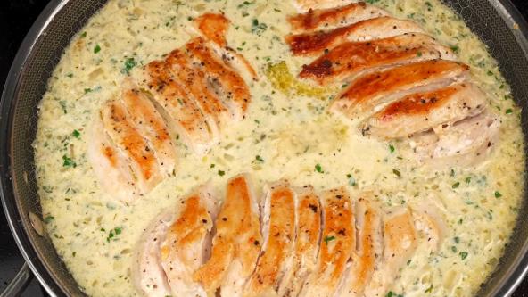 Zagrejte maslinovo ulje pa stavite 2 čena belog luk, koji nije skroz oljušten, već samo zgnječen. Pileća prsa zasecite kao harmoniku pa začinite biberom i solju. Stavite da se prži dok ne porumeni sa obe strane. Crni luk i preostali beli isecite na sitno. Izvadite pileća prsa i ostavite sa strane. Izvadite i beli luk. U isti tiganj stavite puter pa ubacite seckan luk. Kad postane staklast dodajte bujon ili toplu vodu, pavlaku, peršun i sok od limuna. Začinite po ukusu i krčkajte par minuta potom vratite meso i krčkajte sve zajedno još malo u poklopljenom tiganju.