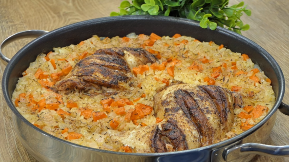 Pomešajte maslinovo ulje, soja sos, so, biber, slatku papriku. Sve lepo sjedinite i batake zasecite, pa lepo utrljajte marinadu. Pokrijte providnom folijom i stavite u frižider na sat vremena. Kratko propržite batake na zagrejanom ulju, tek da dobiju boju. Izvadite meso iz tiganja, pa u isti dodajte seckanu šargarepu i crni luk. Zatim dodajte pirinač koji ste prethodno oprali i kratko propržite. U tepsiju stavite pirinač, crni luk i šargarepu, pa promešajte. Zatim sipajte bujon (napravite ga tako što ćete u vodi rastvoriti kocku supe). Pobiberite i poređajte batake. Premažite ih preostalom marinadom. Pecite u prethodno zagrejanoj rerni na 200°C oko 25 minuta.