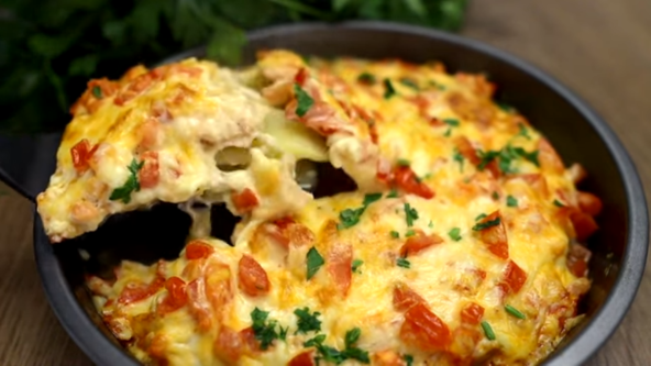 Musaka je jelo koje se pravi od krompira koji se iseče na kolutove i proprženog mlevenog mesa. Preliva se jajima i peče u rerni, a mi vam predlažemo da malo obogatite ukus klasičnog recepta i da umesto mlevenog koristite belo meso. Poređajte sastojke kao za musaku, a preko premažite sir i paradajz koji će se savršeno topiti i razvlačiti, ali i osvežiti. Ova musaka je dobitna kombinacija jer spaja najomiljenije namirnice, a lako se pravi.