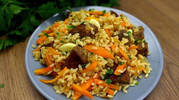Meso isecite na kockice i ispržite u tiganju. Izvadite ga na tanjir. Šargarepu i luk isecite pa propržite u istom tiganju. u vatrostalnu posudu stavite na dno meso, začinite, potom povrće i na kraju pirinač. Sve zalijte vodom. Očišćene čenove belog luka utisnite u pirinač. Peći na 200°C 15 minuta, zatim promešati i peći na 200°C još 10 minuta.