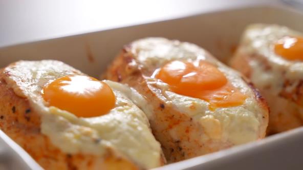 Isecite pileći file u sredini, formirajući džep u sredini (nalik na čamac). Što je džep veći, više punjenja će stati. Stavite foliju u ovaj džep da bi ostao u obliku. Pileći file pospite solju, biberom, suvim belim lukom, dimljenom paprikom. Pržite pileći file sa obe strane 4 minuta dok ne porumeni. Jaja podeliti na belanca i žumanca. Izmiksajte belanca sa krem sirom i mocarelom. Stavite nadev u džepove pilećih fileta. Pecite na 200°C 10 minuta. Izvadite iz rerne, stavite žumanca u centar. Stavite u rernu još 4 minuta.