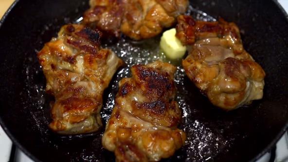 Batake odvojite od kostiju i stavite u činiju. odozgo iseckajte na trake beli luk i đumbir. Dodajte so, biber, šećer i soja sos. sve pomešajte rukama da bolje upije. Pokrijte providnom folijom i ostavite 20 minuta. Zatim, pržite na laganoj vatri 8 minuta sa svake strane, pa dodajte 15 g putera i pržite još 5 minuta. Servirajte toplo.