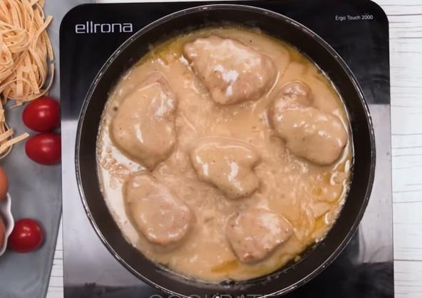 Medaljone stavite u posudu pa polijte maslinovim uljem. Posolite i pobiberite pa rukama uvaljajte da se što bolje upije. Pržite u tiganju na maslacu sa svih strana da lepo zarumeni. Izvadite ih na tanjir a u tom istom tiganju propržite seckan crni i beli luk. Sipajte potom vino i dodajte kockice bri sira i ostavite da se sve rastopi. Posolite i pobiberite. Dodajte brašno i bujon i krčkajte još par minuta. Potom procedite sos. Vratite medaljone u tiganj i prelijte ih sosom. Krčkajte par minuta i servirajte toplo.