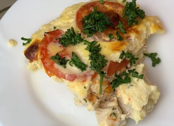 Isecite meso na kockice, pa ga poređajte u nauljenu vatrostalnu posudu. U drugoj posudi umitete jaja koja ste posolili i pobiberili, pa dodajte ostale začine. Zatim dodajte pavlaku i rendani sir (ostavite malo sa strane) i dobro promešajte. Prelijte preko mesa i promešajte da meso lepo upije sos. Zatim poređajte paradajz isečen na kolutove, pa pospite preostalim rendanim sirom. Pokrijte alu folijom i pecite na 200°C oko 25 minuta, a zatim uklonite foliju i pecite još 10 minuta.