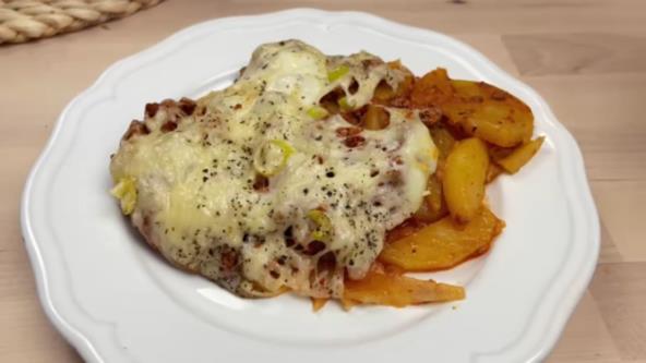 Krompir isecite i poređajte u nauljeni tiganj. Poklopite i pržite 10 minuta, a zatim posolite, pobiberite, pospite slatkom paprikom i origanom. Promešajte i pržite još 5 minuta. Sipajte u posudu u kojoj ćete peći. Zatim na malo ulja propržite sitno seckan crni luk, pa pred kraj dodajte i sitno seckan beli luk. Dodajte mleveno meso i pržite. Pred kraj sipajte paradajz sos. Posolite i pobiberite. Sipajte preko krompira koji ste poravnali, pa isto uradite i sa mesom. Poređajte komade sira, a onda pospite i rendanim sirom. Po želji pospite seckanim prazilukom, origanom. Sipajte i malo ulja, pa pecite u rerni na 200°C oko 15 minuta.