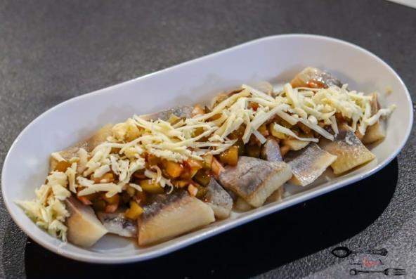 Luk sitno iseckati, a krastavce na male kockice. U seckano povrće dodajte med, kečap i po želji so i biber. Sve temeljno izmešati. Pečeni file ribe isecite na male komade. Poređajte ribu na tanjir. Stavite preko pripremljeno povrće u sosu. Odozgo pospite rendani sir.