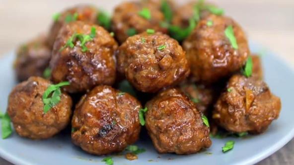 U mleveno meso dodajte sitno seckani crni luk, jaje, posolite, pobiberite, pospite belim lukom i sipajte kečap. Dobro sjedinite i oblikujte ćuftice. Zatim ih propržite na malo ulja, pa dodajte sos koji ste napravili tako što ste pomešali soja sos, pirinčano sirće, smeđi šećer i slatko kiseli sos. Prelijte ga preko ćuftica i dodajte sitno seckani beli luk. Pržite još malo da one upiju sos, pa poslužite i pospite seckanim peršunom.
