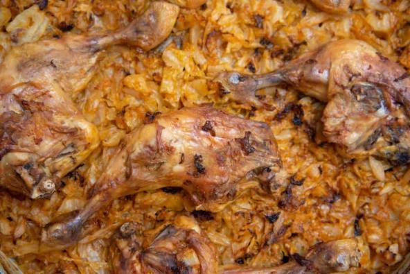 Crni luk sitno iseckajte, pa propržite u zagrejanom tiganju na malo ulja. Zatim dodajte kupus ribanac, promešajte, pa pospite slatku papriku, lovorov list, kim i biber u zrnu. Opet promešajte. Na kraju sipajte vino i ostavite da se dinsta. Povremeno sipajte vodu, kada vidite da fali. Kada se proprži dodajte pirinač, šaku do dve, pa pecite u rerni na 200°C da dobije lepu boju. Batake kratko propržite na malo ulja, a onda stavite preko podvarka i pecite zajedno.