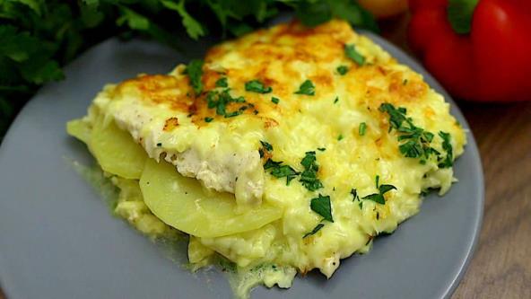 Od omiljenih namirnica, kao što su krompir, belo meso i sir, napravite jelo koje će se svima dopasti. Dosta podseća na musaku, samo što se ređa u manje slojeva, a umesto preliva od jaja, pred kraj pečenja se dodaje smesa od sira, luka i majoneza.Odličan predlog za ručak za celu porodicu, a sastojci su jeftini.