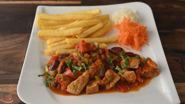 Isecite meso na kockice, pa propržite u tiganju. Zatim ga izvadite, pa u isti dodajte seckani crni luk, a kada omekša dodajte i seckani beli luk. Posle 2 minuta dodajte paprike isečene na sitne kockice, kao i proceđen i opran pasulj. Promešajte, pa sipajte pelat i paradajz pastu. Vratite meso, pa posolite i pobiberite i pospite začinima. Sipajte bujon i dobro promešajte, pa kuvajte dok meso ne omekša, a to je nekih pola sata.