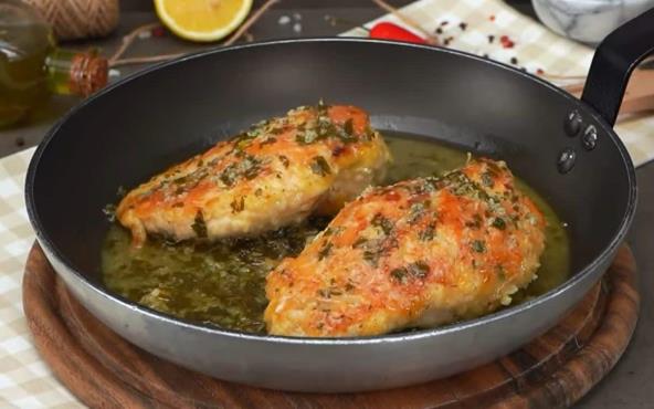 Meso malo istucite, pa onda posolite i pobiberite meso sa obe strane. Jaja umutite sa mleko, a takođe ih posolite i pobiberite i pospite kašikom seckanog peršuna. Meso premažite krem sirom, pa ih uvaljajte u jaja, a onda i u brašno, pa ispržite na malo zagrejanog ulja. Izvadite meso, pa istopite puter i dodajte mleveni beli luk, belo vino i rendanu koru limuna. Kada krene da vri sos vratite meso i ostavite kratko u tiganju.