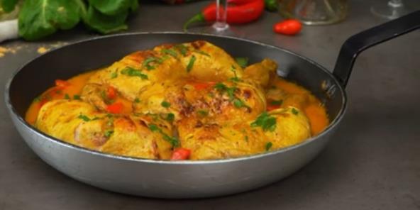 Zasecite batake na par mesta, pa stavite u titanj u kojem je zagrejano ulje. Pomešajte jogurt, so, timijan, kari, slatku papriku i ulje. Dobro promešajte, pa premažite meso. Poklopite i krčajte na tihoj vatri 10 minuta. Nakon toga okrenite meso da se ispeče i marinirana strana. Poklopite i krčkajte na tihoj vatri još 10 minuta. Ponovo okrenite i sipajte belo vino. Poklopite i krčkajte još 20 minuta. Zatim izvadite meso i u isti tiganj dodajte sitno seckani crni luk i krupno sečen beli luk, pa propržite. Dodajte brašno i promešajte, pa nakon 1-2 minuta dodajte i papriku isečenu na trake. Kada paprika omekša sipajte i pavlaku za kuvanje. Posolite, pobiberite, pospite karijem i šećerom i promešajte. Posle 5 minuta vratite meso i poklopite, pa krčkajte još 20 minuta.
