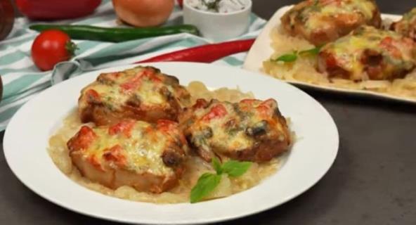 Luk krupno isecite, pa poređajte u tepsiju. Meso zasecite u obliku dijamanta/romboida, pa posolite i pobiberite i poređajte preko luka. U tiganju propržite seckane pečurke, pa dodajte i seckanu papriku. Kada i paprika omekša dodajte seckani paradajz, posolite i pobiberite i ostavite još par minuta. Sipajte povrće u posudu, pa dodajte seckani peršun i mirođiju, rendani sir (100 g) i majonez. Dobro promešajte, pa dobijenu smesu sipajte preko svakog parčeta mesa. Pospite preostalim rendanim sirom (100 g) i pecite u zagrejanoj rerni na 180°C oko 40 minuta.