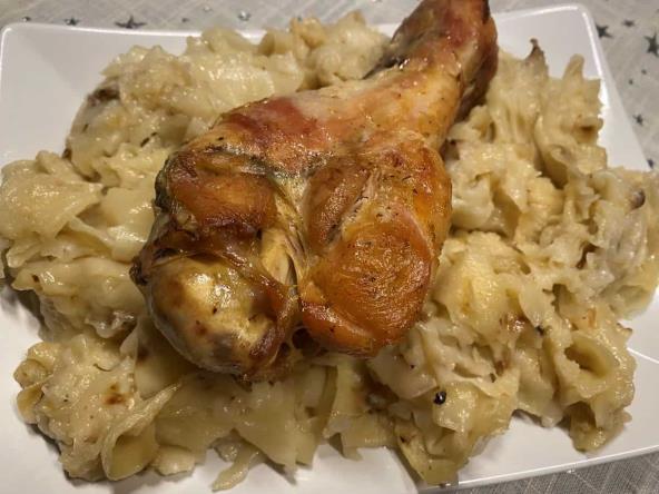 Meso posolite i pobiberite, pa ga nauljite. Ostavite tako da se marinira u frižideru par satu, pa stavite u tepsiju koju ste malo nauljili i pokrijte aluminijumskom folijom. Zatim pecite na 250°C oko 2 sata, a nakon tog vremena skinite foliju da meso dobije boju. Dok se peče nepokriveno, okrenite ga par puta da dobije koricu sa svih strana. Ako je potrebno dodajte i vodu. Mlince izlomite, pa kratko kuvajte u ključaloj vodi koju ste posolili.Procedite, pa stavite u tespiju sa mesom. Pecite ih zajedno sa mesom dok ne dobiju boju, a onda promešajte i pecite još 5 minuta.