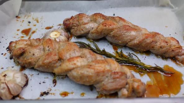 Uzmite komad svinjskog filea i isecite na šest traka jednakih veličina (po dužini). Uzmite 3 trake, spojite i vrh vežite kanapom koji se koristi za kuvanje. Upletite pletenicu i kraj vežite kanapom. Tako uradite i sa druge tri trake. U tiganju istopite puter, pa stavite glavicu belog luka koju ste presekli na pola (ravan deo okrenite na dole). Dodajte i ruzmarin i kratko pržite. Zatim dodajte pletenice od mesa i propržite sa svih strana. U tepsiju koju ste obložili pek papirom stavite meso, luk i ruzmarin. U jednoj posudi napravite preliv tako što ćete pomešati soja sos, začine i med. Dobijenim prelivom premažite meso. Pecite u rerni na 200°C oko 20 minuta.