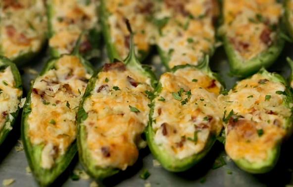 Paprike operite i presecite po dužini, na pola i izvadite koštice. U posudi pomešajte krem sir, rendni čedar, i proprežnu slaninu iseckanu na sitne kockice. Sve dobro sjedinite, pa dodajte mleveni čips (najbolje naćos) i opet lepo promešajte. Napunite paprike, pa poređajte na pleh obložen pek papirom. Pecite na 220°C oko 10 minuta.