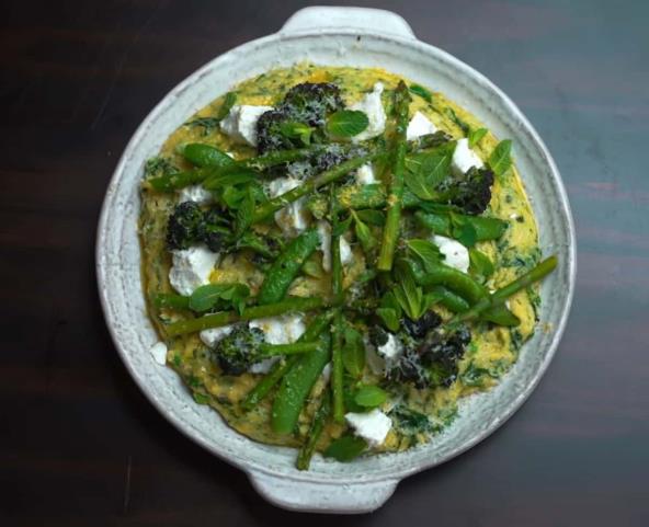 Napravite bujon tako što ćete kocku za supu rastvoriti u vreloj vodi. Promešajte, pa posolite, pobiberite, pospite tucanom paprikom, pa prelijte maslinovim ulje. Stavite da bujon proključa, pa smanjite temeperaturu i postepeno dodajte palentu. Sve vreme mešajte i kuvajte dok se malo ne zgusne. Ugasite šporet, pa dodajte rendani beli luk. Spanać kratko blanširajte, pa kada se prohaldi dobro ocedite od viška vode i sitno ga iseckajte. Možete da koristite i smrznut spanaća, njega samo izvadite dan ranije i kada se otopi, takođe dobro ocedite od viška vode. Zatim spanać dodajte u palentu i dobro promešajte. Sipajte malo maslinovog ulja, pa dodajte rendanu koru limuna i puter. Vratite na šporet i kuvajte dok se sastojci lepo ne sjedine i palenta ne postane kremasta, uz neprestano mešanje. Zatim u smesu dodajte grašak, opet brzo mešajte, kuvajte još 5 minuta, pa dodajte maskarpone sir i sipajte sok od pola limuna. Vratite na šporet i kuvajte još kratko, uz neprestano mešanje. Sklonite sa šporeta, pa dodate rendani parmezan, pa kuvajte još par minuta uz mešanje. Sipajte na tanjir, pa prelijte maslinovim uljem i dekorišite kozijim sirom. Ako želite možete krato da izblanširate smrznuto povrće po želji i njime dodatno dekorišete ovo jelo.