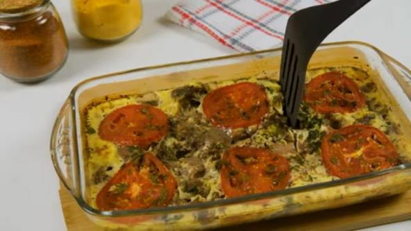 Meso isecite na kockice, pa posolite i pobibierite. Lepo promešajte, pa poređajte u vatrostalnu posudu ili neku tepsiiju. U posudi umutite jaja, pa sipajte pavlaku za kuvanje, začinite italijanskim začinom, origanom i karijem, pa prelijte preko mesa. Sipajte i malo ulja preko, pa poređajte paradajz isečen na kolutove i pecite u zagrejanoj rerni na 200°C oko 20 minuta. Gotovo jelo pospite seckanim peršunom.