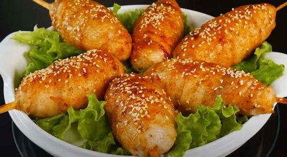 Iseckajte crni luk, kao i svinjetinu i piletinu, pa sve zajedno izblendirajte. Potom prebacite mleveno meso u činiju, pa dodajte so, biber i mešavinu biljnih začina. Dobro sjedinite sastojke rukom. Mocarela sir isecite na 8 komada, pa ga nabijte na štapiće za ražnjiće. Ruke najpre umočite u vodu, pa od mešavine piletine i svinjetine oblikujte malo deblju šniclu. Njom obmotajte sir na štapiću, pa oko nje urolajte parče slanine. Ponovite postupak do utroška materijala, a potom stavite aluminijumsku foliju na pleh i nju premažite uljem.  Pleh pokrijte aluminijumskom folijom, pa pecite na 180°C oko 60 minuta. U posudu ubacite so, crni biber, slatku začinsku papriku, sojin sos, limunov sok i med pa dobro promešajte. Premažite sosom pečeno meso, pa pospite susamom. Predlažemo i ražnjiće od tikvica i piletine.