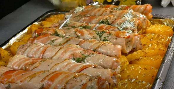 Isecite svinjetinu na 10 šnicli, prekrijte prozirnom folijom, pa istucite čekićem za meso. Pospite so i biber po ukusu sa obe strane, utrljajte začine, stavite šnicle jedne na druge, pa prekrijte prozirnom folijom. Ostavite svinjetinu da se marinira u začinima 30 minuta. U posudu dodajte omekašli puter, iseckanu mirođiju i iseckan beli luk, pa pomešajte sastojke. Opran i oljušten krompir, isecite na tanje komade, pa dodajte 1 i po kašičicu soli, pola kašičice bibera, beli luk u prahu, kurkumu i mešavinu biljnih začina. Na kraju dodajte i maslinovo ulje, pa promešajte začine i krompir. Poređajte krompir po plehu obloženom aluminijumskom folijom i prelijte ih sa ostatkom začina iz posude. Svaki komad mesa premažite mešavinom mirođije i belog luka, ali odvojite jednu kašiku sa strane, urolajte, pa ivice uvucite ka unutra. Urolajte oko svinjetine po list slanine. Nabijte ih na štapiće za ražnjiće sa strane, pa stavite na krompir. Obmotajte aluminijumskom folijom, pa pecite na 180°C oko 60-70 minuta. Izvadite, pa meso premažite puterom, mirođijom i belim lukom koji se odvojili sa strane. Vratite u rernu na 240°C još 10 minuta. Izvadite štapiće i služite. Preporučujemo i svinjske rolnice sa sirom i šunkom.