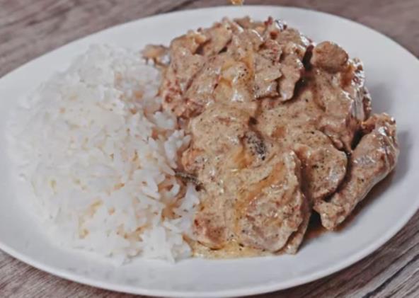 Poklopite i kuvajte meso nekih 25 minuta. Na kraju dodajte kiselu pavlaku i promešajte. Poklopite i dinstajte nekih 15 minuta. Ako je potrebno dodajte malo vode. Služite sa pire krompirom i pirinčem.