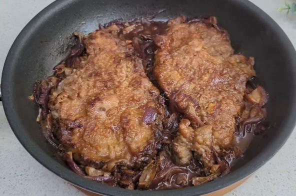 Izvadite meso iz tiganja, pa u isti dodajte ljubičasti luk isečen na rebarca, pa dodajte i pečurke koje ste prethodno kratko potopili u vodu. U posudi pomešajte koka-kolu, sojin sos, kečap, sirće i šećer. Lepo promešajte, pa sipajte u tiganj. Promešajte, pa vratite meso u tiganj i poklopite. Krčkajte još 15-20 minuta.