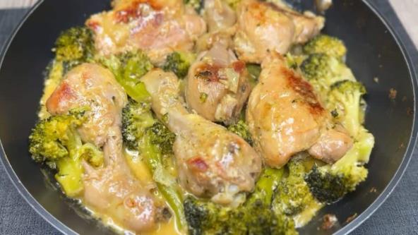 Meso posolite, pobiberite i pospite slatkom paprikom. Lepo utrljajte začine, pa prelijte maslinovim ulje. Pokrijte providnom folijom i marinirajte pola sata. Zatim u tiganj sipajte malo ulja i istopite puter, pa propržite batake. Izvadite meso kada se proprži, pa u isti tiganj dodajte sitno seckani crni luk i ceo čen belog luka (koji ste spljoštili nožem), kao i seckanu ljutu papriku. Posle par minuta izvadite beli luk i ljutu papriku, a zatim dodajte seckani brokoli, pa pržite par minuta. Vratite meso u tiganj. Pavlaku za kuvanje pomešajte sa senfom, pa sve lepo sjedinite. Sipajte u tiganj, pa sipajte i malo vode i kuvajte dok ne krene da ključa. Zatim poklopite i kuvajte još pola sata.