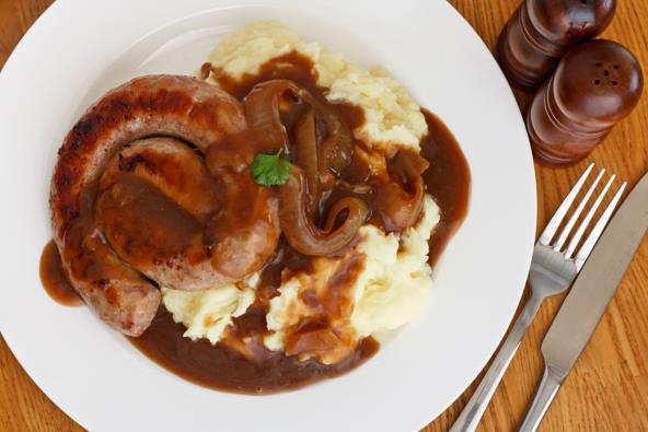 Prepolovite luk, oljuštite ga, a zatim ga iseckajte na trakice. Očistite čen belog luka i sitno ga iseckajte. Pomešajte sastojke za sos, osim rakije. Zagrejte tiganj na srednje jakoj vatri i dodajte mast. Ubacite luk i grančice majčine dušice i dinstajte 10-12 minuta ili dok luk ne počne da omekšava i dobija boju. Dodajte beli luk i dinstajte još minut. Sipajte brašno i biber i dinstajte još minut uz stalno mešanje.